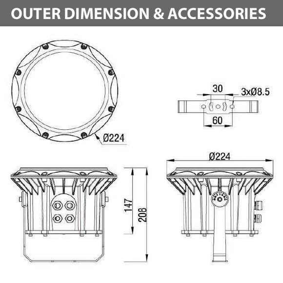 Outdoor LED Projector Lights - JRF3-18 - Diamension